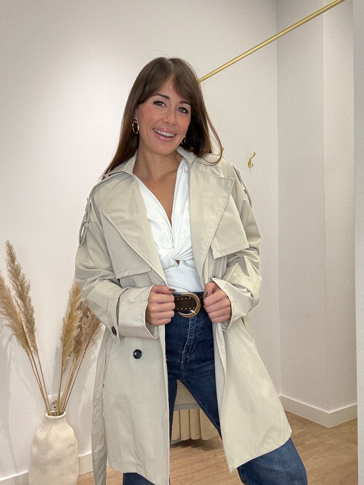 Esta gabardina de largo medio es una de esas prendas que nunca pasan de moda y que te salvan cualquier outfit. Su diseño clásico con cinturón y solapas amplias aporta ese aire elegante y femenino que tanto nos gusta, pero con el toque actual y desenfadado que la hace perfecta para el día a día. Talla única (que en este modelo equivale a 36/38/40)