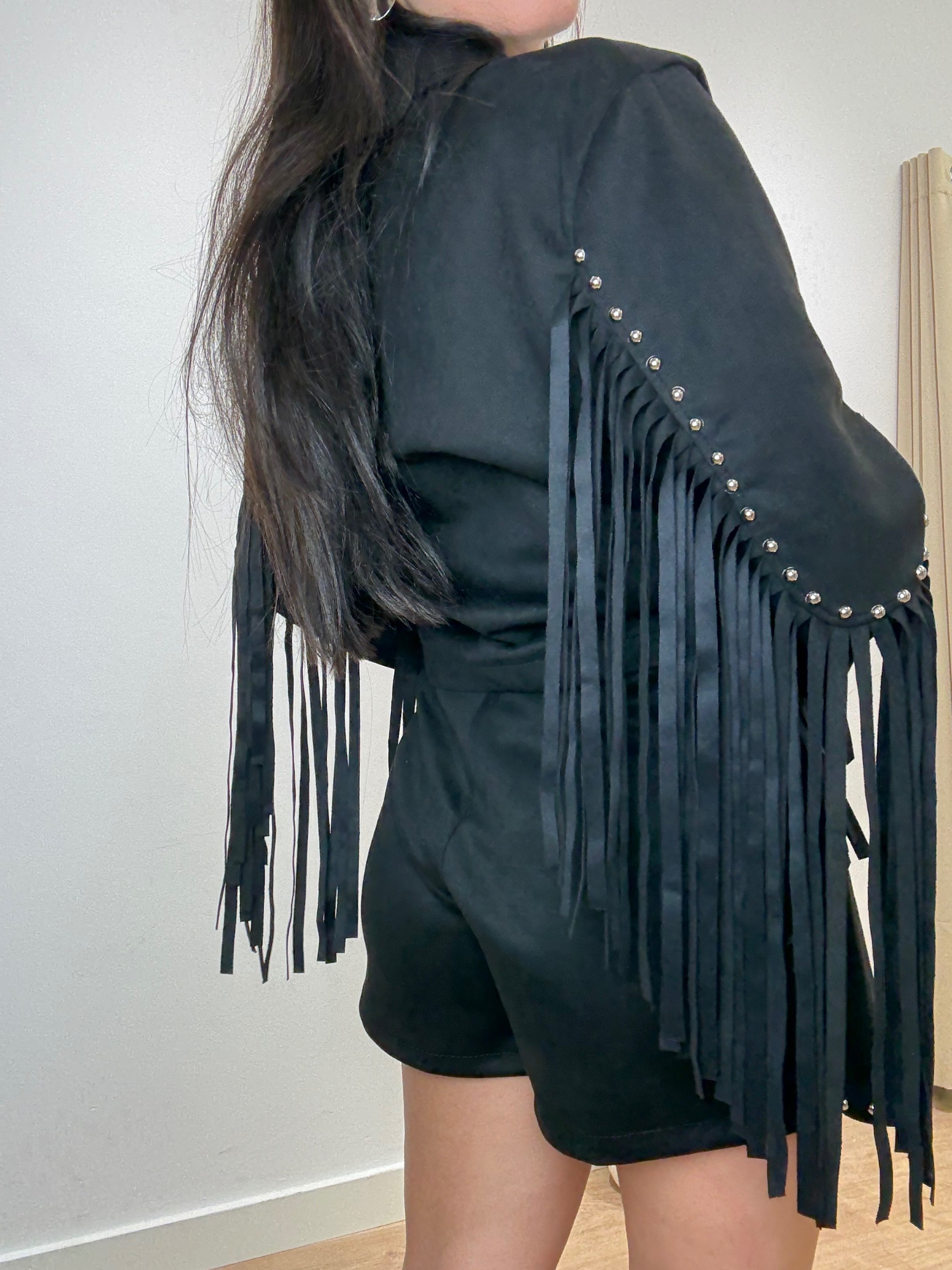 A juego con su chaqueta con flecos y tachuelas, por si quieres hacerte con el conjunto completo y arrasar.