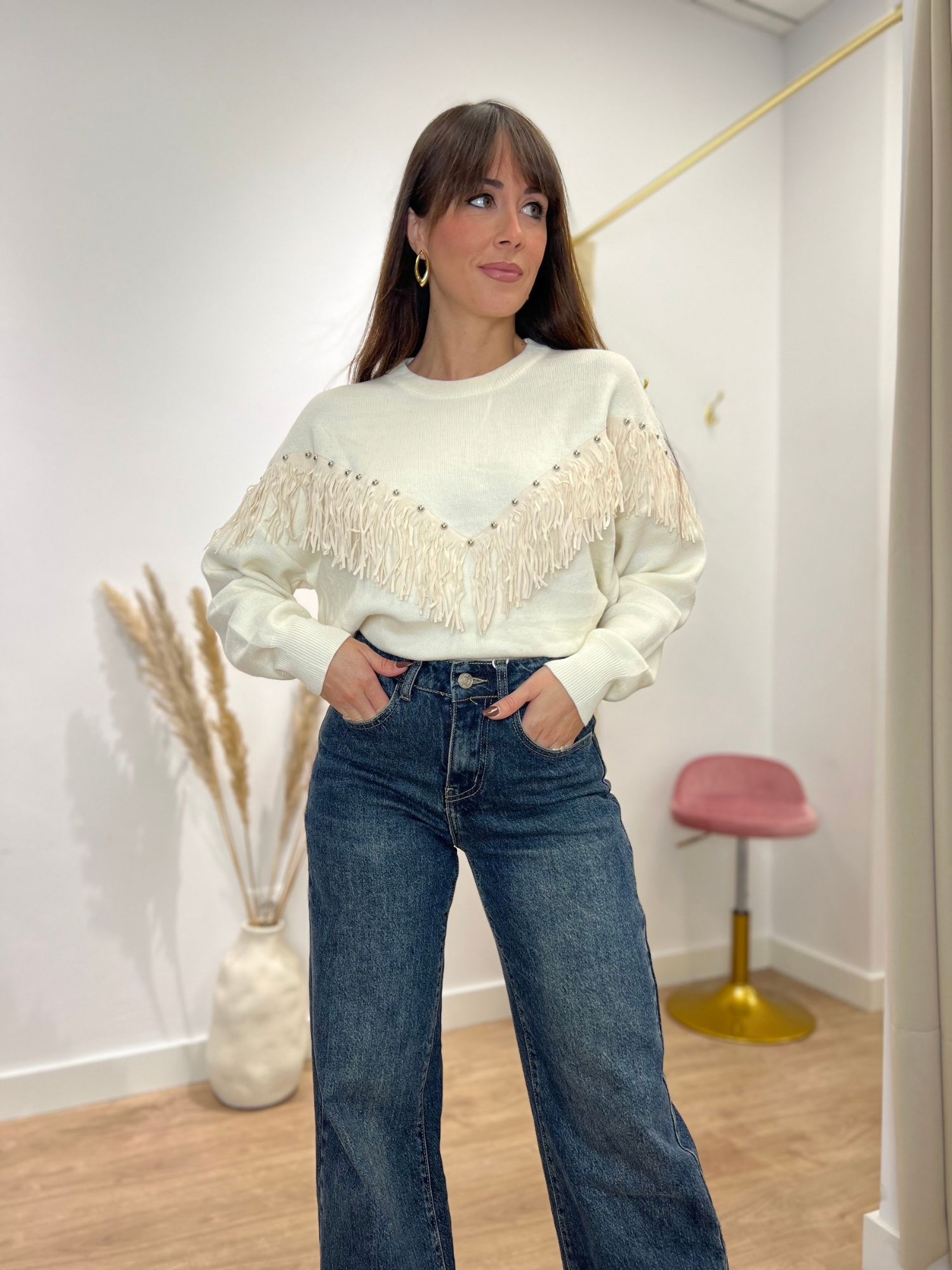 Este jersey es de esos que transforman un look básico en algo especial sin esfuerzo. El detalle de flecos con tachuelas crea una forma en V que estiliza y llama la atención justo donde favorece. Si te cuesta salir del típico jersey liso… este te lo pone fácil. Talla única (que en este modelo equivale a 36/38/40).