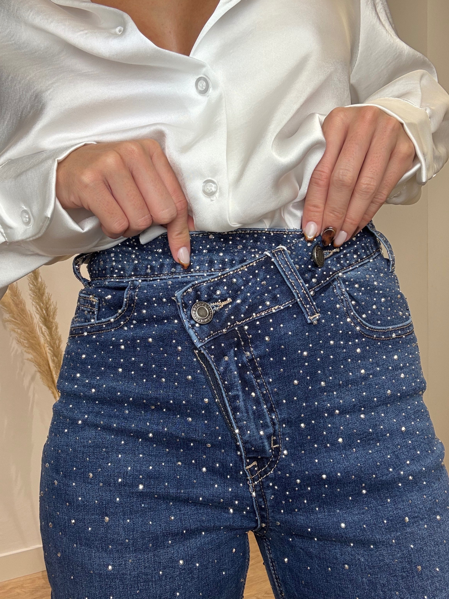 Este vaquero con cintura asimétrica y detalles brillantes es esa prenda especial que transforma cualquier look. Su diseño moderno, con silueta de pierna recta y cintura alta, realza la figura y aporta un toque de glamour sin perder comodidad.