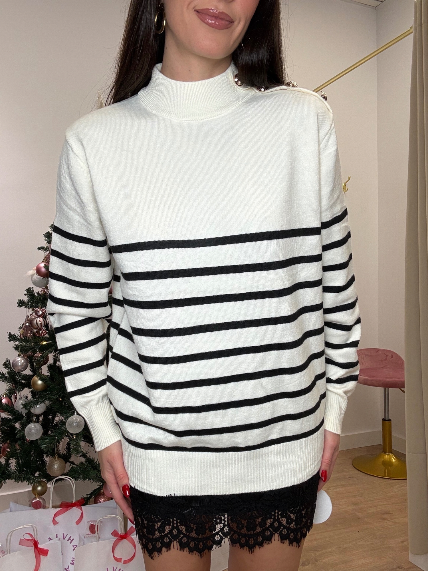 Detalle de botones dorados en el hombro. Aporta un toque sofisticado y llamativo, marcando la diferencia sin necesidad de accesorios extra.